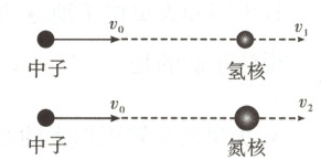 解题思路设中子的质量为m,则氢核的质量m_{1}=m,氮核的质量m_{2}=14m,当中子与氢核碰撞时,有mv_{0}=mv_{中1}+m_{1}v_{1},$\frac{1}{2}$mv_{0}^{2}=$\frac{1}{2}$mv_{中1}^{2}+$\frac{1}{2}$m_{1}v_{1}^{2},解得v_{1}=$\frac{2m}{m+m_{1}}$v_{0}=v_{0},则碰撞后,氢核的动量p_{1}=m_{1}v_{1}=mv_{0},氢核的动能E_{k1}=$\frac{1}{2}$m_{1}v_{1}^{2}=$\frac{1}{2}$mv_{0}^{2};当中子与氮核碰撞时,有mv_{0}=mv_{中2}+m_{2}v_{2},$\frac{1}{2}$mv_{0}^{2}=$\frac{1}{2}$mv_{中2}^{2}+$\frac{1}{2}$m_{2}v_{2}^{2},解得v_{2}=$\frac{2m}{m+m_{2}}$v_{0}=$\frac{2}{15}$v_{0},则碰撞后,氮核的动量p_{2}=m_{2}v_{2}=$\frac{28}{15}$mv_{0},氮核的动能E_{k2}=$\frac{1}{2}$m_{2}v_{2}^{2}=$\frac{28}{225}$mv_{0}^{2}。综上可得p_{1}<p_{2},E_{k1}>E_{k2},v_{1}>v_{2},v_{2}<v_{0},故B正确,A、C、D错误。