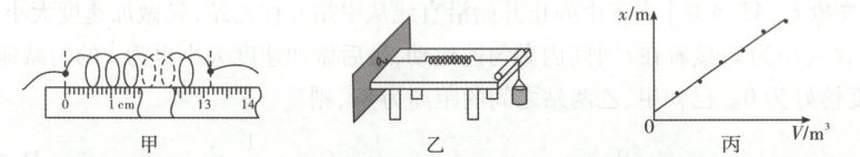 (4) 以小桶中水的体积$V$为横坐标,弹簧伸长量$x$为纵坐标,根据实验数据拟合成如图丙所示直线,其斜率为$200 m^{-2}$。由此可得该弹簧的劲度系数为