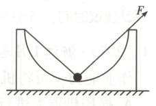 6. [2025·河北卷,4T,4分] 如图,内壁截面为半圆形的光滑凹槽固定在水平面上,左右边沿等高。该截面内,一根不可伸长的细绳穿过带有光滑孔的小球,一端固定于凹槽左边沿,另一端过右边沿并沿绳方向对其施加拉力$F$。小球半径远小于凹槽半径,所受重力大小为$G$。若小球始终位于内壁最低点,则$F$的最大值为 (