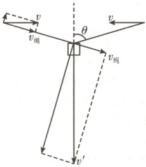解题思路 设塔块的速度为$v'$,细绳与竖直方向间的夹角为$\theta$,对手的速度$v$和塔块的速度$v'$分别沿细绳方向和垂直于细绳方向进行分解,如图所示。则沿细绳方向有$v$_________${ \mathrm { 绳 } } = v \sin \theta$,$v$_________${ \mathrm { 绳 } } = v ' \cos \theta$,联立解得$v = \frac { v ' } { \tan \theta }$,塔块沿竖直方向匀速下落的过程,$v'$不变,$\theta$逐渐减小,则$v$一直增大。故B正确,A、C、D错误。