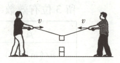 3. [2025·黑龙江卷,6T,4分]如图,趣味运动会的“聚力建高塔”活动中,两长度相等的细绳一端系在同一塔块上,两名同学分别握住绳的另一端,保持手在同一水平面以相同速率$v$相向运动。为使塔块沿竖直方向匀速下落,则$v$ (