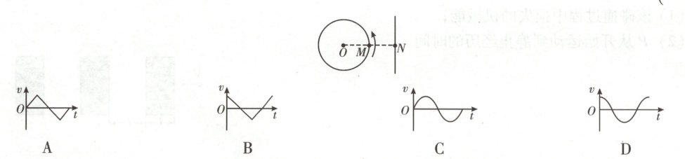 4. [2025·安徽卷,6T,4分]在竖直平面内,质点$M$绕定点$O$沿逆时针方向做匀速圆周运动,质点$N$沿竖直方向做直线运动,$M$、$N$在运动过程中始终处于同一高度。$t = 0$时,$M$、$N$与$O$点位于同一直线上,如图所示。此后在$M$运动一周的过程中,$N$运动的速度$v$随时间$t$变化的图像可能是 (