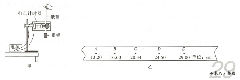 (2) 图乙所示是纸带上连续打出的五个点$A$、$B$、$C$、$D$、$E$到起点的距离。则打出$B$点时重锤下落的速度大小为