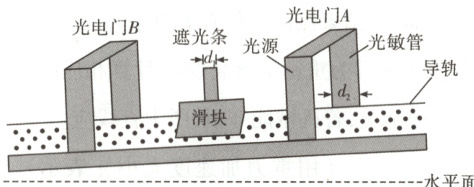 (选填“甲”“乙”或“丙”)同学的方案不可行。(2) 如图,光电门中光源与光敏管相对,光源发出的光使光敏管感光。当滑块经过时,遮光条把光遮住,计时器记录遮光时间,可计算出滑块的速度。实验中使用的遮光条宽度$d_1 = 10.0 \ mm$,光电门宽度$d_2 = 20.0 \ mm$。某次测量时,记录通过光电门$A$的遮光时间为$25.0 \ ms$,则滑块经过光电门$A$的速度大小为