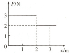 解题思路 根据题意可知,物块由静止运动到$x = 3\ m$处的过程,$F$做的总功为$W_F = 3 × 2\ J + 2 × 1\ J = 8\ J$,该过程,根据动能定理有$W_F = \frac{1}{2}mv^{2}$,解得物块运动到$x = 3\ m$处时的速度大小为$v = 4\ m/s$,则此时$F$做功的瞬时功率为$P = Fv = 8\ W$,故A正确,B、C、D错误。