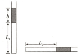 13. (10分)用热力学方法可测量重力加速度。如图所示,粗细均匀的细管开口向上竖直放置,管内用液柱封闭了一段长度为$L_1$的空气柱。液柱长为$h$,密度为$\rho$。缓慢旋转细管至水平,封闭空气柱长度为$L_2$,大气压强为$p_0$。