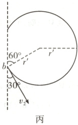 解得$v_1=\frac{E}{B}=\frac{2\sqrt{3}}{3}v_0=v_0$。根据速度分解的规则可得另一分速度$v_2 = 2v\cos30^{\circ}=2v_0$,方向与竖直方向间的夹角为$30^{\circ}$。则粒子在平行板电容器右侧的运动可分解为竖直向上速度为$v_1$的匀速直线运动和速率为$v_2$的匀速圆周运动。设粒子以速率$v_2$做匀速圆周运动的轨迹半径为$r'$,则由洛伦兹力提供向心力有$qv_2B=m\frac{v_2^2}{r'}$,解得$r' = d$,作出粒子以速率$v_2$做匀速圆周运动的轨迹,如图丙所示。