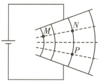 4. [2025·甘肃卷,5T,4分] 如图,两极板不平行的电容器与直流电源相连,极板间形成非匀强电场,实线为电场线,虚线表示等势面。$M$、$N$点在同一等势面上,$N$、$P$点在同一电场线上。下列说法正确的是(