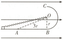 7. [2025·黑龙江卷,7T,4分] 如图,光滑绝缘水平面$AB$与竖直面内光滑绝缘半圆形轨道$BC$在$B$点相切,轨道半径为$r$,圆心为$O$,$O$、$A$间距离为$3r$。原长为$2r$的轻质绝缘弹簧一端固定于$O$点,另一端连接一带正电的物块。空间存在水平向右的匀强电场,物块所受的电场力与重力大小相等。物块在$A$点左侧释放后,依次经过$A$、$B$、$C$三点时的动能分别为$E_{kA}$、$E_{kB}$、$E_{kC}$,则 (