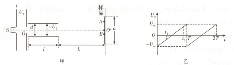 9. [2025·甘肃卷,7T,4分] 离子注入机是研究材料辐照效应的重要设备,其工作原理如图甲所示。从离子源$S$释放的正离子(初速度视为零)经电压为$U_1$的电场加速后,沿$OO'$方向射入电压为$U_2$的电场($OO'$为平行于两极板的中轴线),极板长度为$l$、间距为$d$,$U_2 - t$关系如图乙所示。长度为$a$的样品垂直放置在距$U_2$极板$L$处,样品中心位于$O'$点。假设单个离子在通过$U_2$区域的极短时间内,电压$U_2$可视为不变,当$U_2 = \pm U_m$时,离子恰好从两极板的边缘射出。不计重力及离子间的相互作用。则说法错误的是(
