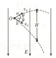 (2)以地面为参考系,粒子a、b的加速度相同,则以b为参系,如图所示,可知粒子a相对于粒子b以$2v_0\sin\theta$的速度向上做匀速直线运动,则$H = 2v_0\sin\theta · t = \frac{2mv_0^2\sin^2\theta}{qE}$。
