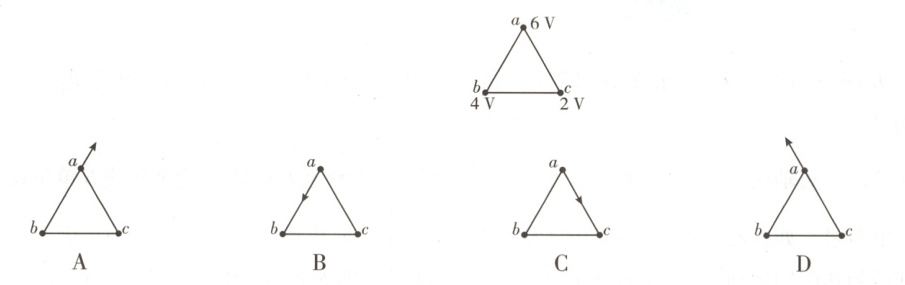 2. [2025·河南卷,4T,4分] 如图,在与纸面平行的匀强电场中有 $a、b、c$ 三点,其电势分别为 $6\ V、4\ V、2\ V$;$a、b、c$ 分别位于纸面内一等边三角形的顶点上。下列图中箭头表示 $a$ 点电场的方向,则正确的是 (