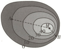 4. [2025·北京卷,8T,3分] 某小山坡的等高线如图,$M$ 表示山顶,$A、B$ 是同一等高线上两点,$MA、MB$ 分别是沿左、右坡面的直滑道。山顶的小球沿滑道从静止滑下,不考虑阻力,则 (