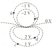 3. [2025·云南卷,4T,4分] 某介电电泳实验使用非匀强电场,该电场的等势线分布如图所示。$a、b、c、d$ 四点分别位于电势为 $-2\ V、-1\ V、1\ V、2\ V$ 的等势线上,则 (