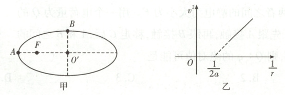 11. [2025·广西卷,14T,11分] 在真空中,一个电荷量为 $-q$、质量为 $m$ 的试探电荷绕电荷量为 $+Q$ 的点电荷做椭圆轨道运动,如图甲,$O'$ 为椭圆中心,$O'A$ 为半长轴,长度为 $a$,$O'B$ 为半短轴,点电荷处于椭圆的焦点 $F$ 处,焦距为 $c$。图乙是 $v^2 - \frac{1}{r}$ 的关系图,其中 $v$ 为该试探电荷运动速率,$r$ 为该试探电荷到点电荷的距离。距离点电荷 $r$ 处的电势 $\varphi = \frac{kQ}{r}$,其中 $k$ 为静电力常量。重力和万有引力忽略不计。