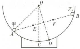 9. [2025·山东卷,11T,4分] (多选) 球心为 $O$、半径为 $R$ 的半球形光滑绝缘碗固定于水平地面上,带电量分别为 $+2q$ 和 $+q$ 的小球甲、乙刚好静止于碗内壁 $A、B$ 两点,过 $O、A、B$ 的截面如图所示,$C、D$ 均为圆弧上的点,$OC$ 沿竖直方向,$\angle AOC = 45°$,$OD \perp AB$,$A、B$ 两点间距离为 $\sqrt{3}R$,$E、F$ 为 $AB$ 连线的三等分点。下列说法正确的是 (