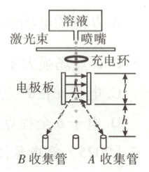 10. [2025·河南卷,13T,10分] 流式细胞仪可对不同类型的细胞进行分类收集,其原理如图所示。仅含有一个 $A$ 细胞或 $B$ 细胞的小液滴从喷嘴喷出(另有一些液滴不含细胞),液滴质量均为 $m = 2.0 × 10^{-10}\ kg$。当液滴穿过激光束、充电环时被分类充电,使含 $A、B$ 细胞的液滴分别带上正、负电荷,电荷量均为 $q = 1.0 × 10^{-13}\ C$。随后,液滴以 $v = 2.0\ m/s$ 的速度竖直进入长度 $l = 2.0 × 10^{-2}\ m$ 的电极板间,板间电场均匀、方向水平向右,电场强度大小为 $E = 2.0 × 10^4\ N/C$。含细胞的液滴最终被分别收集在极板下方 $h = 0.1\ m$ 处的 $A、B$ 收集管中。不计重力、空气阻力以及带电液滴间的作用。求: