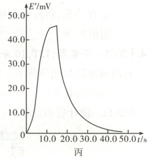 (2) 闭合开关$\mathrm{S}_1$、$\mathrm{S}_2$,实验测得组合体电阻为$0.02 \Omega$,当电磁铁线圈中的电流小于$142 \mathrm{mA}$时,电磁铁无法继续吸合衔铁,衔铁被释放。断开开关$\mathrm{S}_1$、$\mathrm{S}_2$,从室温加热热电偶感温端到某一温度后,停止加热,使其自然冷却至室温。测得整个过程中热电偶受热产生的电动势$E'$随时间$t$的变化关系如图丙所示。在相同的加热和冷却过程中,如果将$A$、$B$端直接连接,不计温度变化对组合体电阻的影响,从停止加热到吸合的衔铁被释放,所用的时间约为
