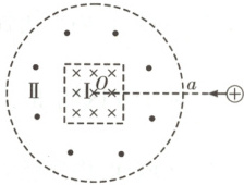 5. [2025·四川卷,10T,6分] (多选) 如图所示,Ⅰ 区有垂直于纸面向里的匀强磁场,其边界为正方形;Ⅱ 区有垂直于纸面向外的匀强磁场,其外边界为圆形,内边界与 Ⅰ 区边界重合;正方形与圆形中心同为 $O$ 点。Ⅰ 区和 Ⅱ 区的磁感应强度大小比值为 $4:1$。一带正电的粒子从 Ⅱ 区外边界上 $a$ 点沿正方形某条边的中垂线方向进入磁场,一段时间后从 $a$ 点离开。取$\sin 37° = 0.6$。则带电粒子