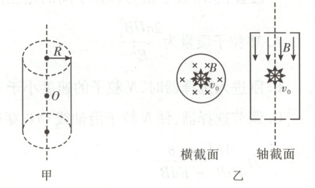 8. [2025·陕西卷,14T,14分] 电子比荷是描述电子性质的重要物理量。在标准理想二极管中利用磁控法可测得比荷,一般其电极结构为圆筒面与中心轴线构成的圆柱体系统,结构简化如图甲所示,足够长圆柱形筒半径为 $R$,正中央有一电子发射源 $O$ 持续向空间各方向发射大量速度大小均为 $v_0$ 的电子。某时刻起筒内加大小可调节且方向沿轴向下的匀强磁场,筒的横截面及轴截面示意图如图乙所示,当磁感应强度大小从 0 缓慢调至 $B_0$ 时,恰好没有电子落到筒壁上,不计电子间相互作用及其重力的影响。求:($R$、$v_0$、$B_0$ 均为已知量)