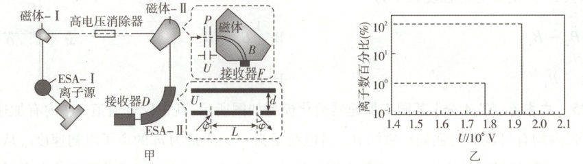 10. [2025·浙江1月卷,18T,13分] 同位素$^{14}_6C$ 相对含量的测量在考古学中有重要应用,其测量系统如图甲所示。将少量古木样品碳化、电离后,产生的离子经过静电分析仪 ESA-Ⅰ、磁体-Ⅰ 和高电压清除器,让只含有三种碳同位素$^{12}_6C$、$^{13}_6C$、$^{14}_6C$ 的 $C^{3+}$ 离子束(初速度可忽略不计) 进入磁体-Ⅱ。磁体-Ⅱ 由电势差为 $U$ 的加速电极 $P$,磁感应强度为 $B$、半径为 $R$ 的四分之一圆弧管道和离子接收器 $F$ 构成。通过调节 $U$,可分离$^{12}_6C$、$^{13}_6C$、$^{14}_6C$三种同位素,其中$^{12}_6C$、$^{13}_6C$ 的 $C^{3+}$ 离子被接收器 $F$ 接收并计数。通过接收器 $F$ 所接收的离子数百分比与 $U$ 之间的关系曲线如图乙所示,而$^{14}_6C$ 离子可通过接收器 $D$ 接收并计算。