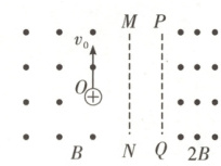 9. [2025·湖北卷,14T,16分] 如图所示,两平行虚线 $MN$、$PQ$ 间无磁场。$MN$ 左侧区域和 $PQ$ 右侧区域内均有垂直于纸面向外的匀强磁场,磁感应强度大小分别为 $B$ 和 $2B$。一质量为 $m$、电荷量为 $q$ 的带正电粒子从 $MN$ 左侧 $O$ 点以大小为 $v_0$ 的初速度射出,方向平行于 $MN$ 向上。已知 $O$ 点到 $MN$ 的距离为$\frac{3mv_0}{2qB}$,粒子能回到 $O$ 点,并在纸面内做周期性运动。不计重力,求: