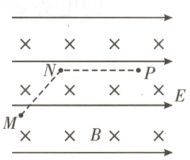3. [2025·福建卷,7T,6分] (双选)如图,竖直面内存在垂直纸面向里的匀强磁场$B$与水平向右的匀强电场$E$,一带电粒子在复合场中恰能沿着$MN$做匀速直线运动,当粒子运动到$N$点时,撤去磁场,一段时间后粒子经过$P$点,已知$MN$与水平面的夹角为$45°$,$NP$水平向右。粒子带电荷量为$q$,速度为$v$,质量为$m$,重力加速度为$g$。则