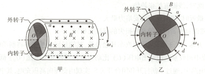 (3)四个线圈带动四个内转子转动,可选择其中一个线圈abcd分析。设内转子转动的角速度为$\omega$,则线圈产生的电动势大小为$E^{\prime\prime}=2BL(\omega_{0}-\omega)r_{1}$,