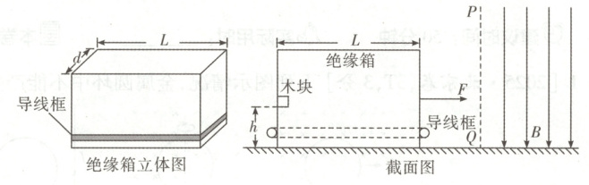8. [2025·云南卷,15T,15分]如图所示,光滑水平面上有一个长为$L$、宽为$d$的长方体空绝缘箱,其四周紧固一电阻为$R$的水平矩形导线框,箱子与导线框的总质量为$M$。与箱子右侧壁平行的磁场边界平面如截面图中虚线$PQ$所示,边界右侧存在范围足够大的匀强磁场,其磁感应强度大小为$B$、方向竖直向下。$t=0$时刻,箱子在水平向右的恒力$F$(大小未知)作用下由静止开始做匀加速直线运动,这时箱子左侧壁上距离箱底$h$处、质量为$m$的木块(视为质点)恰好能与箱子保持相对静止。箱子右侧壁进入磁场瞬间,木块与箱子分离;箱子完全进入磁场前某时刻,木块落到箱子底部,且箱子与木块均不反弹(木块下落过程中与箱子侧壁无碰撞);木块落到箱子底部时即撤去$F$。运动过程中,箱子右侧壁始终与磁场边界平行,忽略箱壁厚度、箱子形变、导线粗细及空气阻力。木块与箱子内壁间的动摩擦因数为$\mu$,假设最大静摩擦力等于滑动摩擦力,重力加速度大小为$g$。