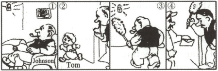 Mr Johnson was reading a newspaper at home when he heard the doorbell ringing.He thought a friend of his was coming to visit him,so he hurried to open the door.He was angry when he saw it was little Tom who came to make fun of him.