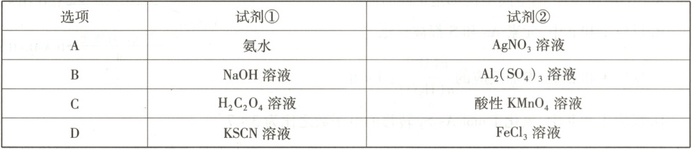 解题思路:氨水滴入AgNO₃溶液中,先产生白色沉淀,后来白色沉淀溶解;AgNO₃溶液滴入氨水中,开始一段时间无明显现象,不断滴入AgNO₃溶液,后来开始产生白色沉淀。A项不符合题意。NaOH溶液滴入Al₂(SO₄)₃溶液,先产生白色沉淀,后来白色沉淀溶解;Al₂(SO₄)₃溶液滴入NaOH溶液开始一段时间无明显现象,不断滴入Al₂(SO₄)₃溶液,后来开始产生白色沉淀。B项不符合题意。H₂C₂O₄溶液滴入酸性KMnO₄溶液中,溶液紫色逐渐褪去,并有气泡产生,溶液最终为无色;酸性KMnO₄溶液滴入H₂C₂O₄溶液中,紫色迅速褪去,并有气泡产生,溶液最终为紫色。C项不符合题意。KSCN溶液滴入FeCl₃溶液中,溶液变为红色;FeCl₃溶液滴入KSCN溶液中,溶液同样变为红色。D项符合题意。