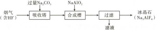 解题思路陶瓷中含有$SiO_2$,$SiO_2$可与HF发生反应$SiO_2 + 4HF \longrightarrow SiF_4\uparrow + 2H_2O$,因此不宜用陶瓷作吸收塔内衬材料,A项正确。采用溶液喷淋法可增大反应物之间的接触面积,提高吸收塔内烟气吸收效率,B项正确。烟气(含HF)进入吸收塔,与过量的$Na_2CO_3$发生反应$Na_2CO_3 + 2HF \longrightarrow 2NaF + H_2O + CO_2\uparrow$,向合成槽中加入$NaAlO_2$,发生反应$6NaF + NaAlO_2 + 2CO_2 \longrightarrow Na_3AlF_6 + 2Na_2CO_3$,过滤得到$Na_3AlF_6$和含有$Na_2CO_3$的滤液,C项错误。滤液中溶质的主要成分为$Na_2CO_3$,可回收进入吸收塔循环利用,D项正确。