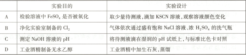 解题思路:FeSO₄被氧化,Fe²⁺转化为Fe³⁺,可用KSCN溶液检验Fe³⁺,A项正确。实验室制备的Cl₂中含有HCl气体和水蒸气,可先用饱和NaCl溶液除去HCl气体,再用浓硫酸除去水蒸气,B项正确。湿润的pH试纸会使NaOH溶液的浓度减小,使测定的pH偏小,C项错误。CaO与水反应生成Ca(OH)₂,Ca(OH)₂的沸点较高,与乙醇的沸点差异大,蒸馏即可得到无水乙醇,D项正确。