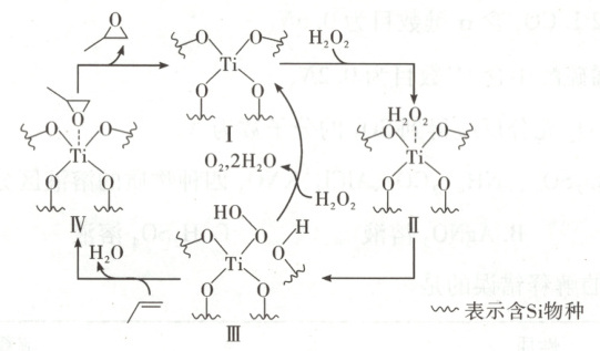 14. 环氧化合物是重要的有机合成中间体。以钛掺杂沸石为催化剂,由丙烯($/\!\!/$)为原料生产环氧丙烷($◯\!\!\!-\!\!\!-$ )的反应机理如图所示。下列说法正确的是 (