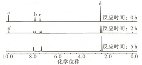 (2)根据反应液的核磁共振氢谱(已去除溶剂H的吸收峰,谱图中无羧基H的吸收峰)监测反应进程如下图。已知峰面积比a : b : c : d = 1 : 2 : 2 : 3,a : a′ = 2 : 1。反应2 h时,对甲基苯甲醛转化率约为