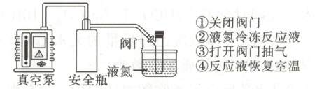 (5)用同位素示踪法确定产物羧基O的来源。丙酮易挥发,为保证$^{18}\mathrm{O}_{2}$气氛,通$^{18}\mathrm{O}_{2}$前,需先使用“循环冷冻脱气法”排出装置中(空气中和溶剂中)的$^{16}\mathrm{O}_{2}$,操作顺序为:①→②→