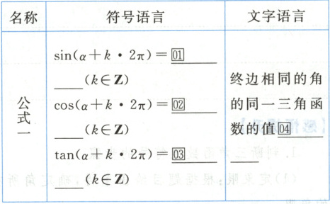 (2)公式一的结构特征:①左、右为同一三角函数;②公式左边的角为$\alpha + k·2\pi(k\in\mathbf{Z})$,右边的角为$\alpha$.