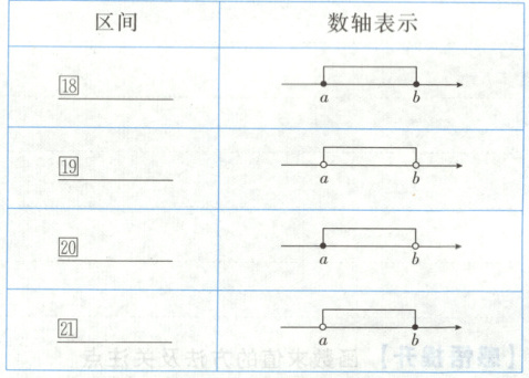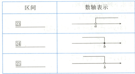 满足$x\geq a$,$x>a$,$x\leq b$,$x<b$的实数$x$的集合,用区间分别表示为⑫, ⑬ , ⑭ ,⑮ .