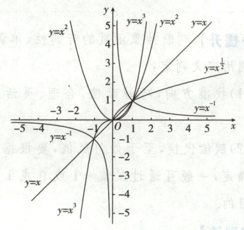 同一坐标系中,幂函数 $y=x$,$y=x^2$,$y=x^3$,$y=x^{\frac{1}{2}}$,$y=x^{-1}$ 的图象(如图)。