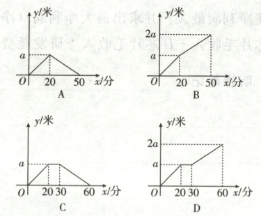 1. 设甲、乙两地的距离为$ a(a>0) $米,小王骑自行车匀速从甲地到乙地用了20分钟,在乙地休息10分钟后,他又匀速从乙地返回到甲地用了30分钟,则小王从出发到返回原地所走过的路程y(单位:米)与其所用的时间x(单位:分)的函数图象为 (