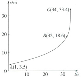 $v = \frac{\Delta s}{\Delta t} = \frac{14.8}{34 - 32} = \frac{14.8}{2} = 7.4\ m/s$。