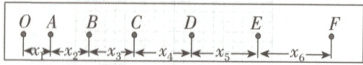 例② 某同学在做“用打点计时器测速度”的实验时,得到一条点迹清晰的纸带如图所示,在纸带上依次选出7个计数点,分别标以$O$、$A$、$B$、$C$、$D$、$E$和$F$,每相邻的两个计数点间还有4个点未画出,每相邻两计数点间时间间隔为$T$,打点计时器所用电源的频率是$50\ Hz$。