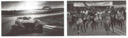 如图所示,在体育赛事中,我们说“某辆赛车性能不佳,起步太‘慢’”,又说“某同学身体素质好,有很好的爆发力,起跑‘快’”。以上说法中的“快”与“慢”的含义是什么?