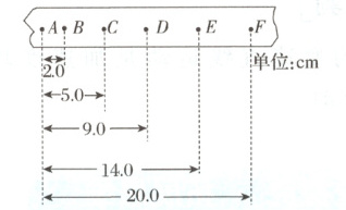 例② 在“探究小车速度随时间变化的规律”的实验中,打点计时器使用的交流电源的频率为 $50\ Hz$,记录小车运动的一段纸带如图所示,在纸带上选择 A、B、C、D、E 六个计数点,相邻两计数点之间还有四个点未画出。
