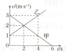 例4 D 甲的初速度为$3m/s$,乙的初速度为$1m/s$,因此甲和乙的初速度方向相同,大小之比为$3:1$,选项A错误;在$t = 4s$时,甲的瞬时速度为$1m/s$,乙的瞬时速度为$3m/s$,选项B错误;在$t = 2s$时,两者的瞬时速度相同,大小都为$2m/s$,甲沿正方向做匀减速直线运动,乙沿正方向做匀加速直线运动,甲的加速度为$-0.5m/s^2$,乙的加速度为$0.5m/s^2$,因此甲和乙的加速度不相同,选项C错误,D正确。