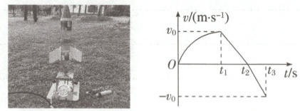 3. 如图所示,水火箭是一个利用质量比和气压作用而设计的玩具。压缩空气把水从火箭尾部的喷嘴向下高速喷出,在反作用下,水火箭快速上升,飞到一定高度后,在重力的作用下落下来。水火箭运动的$v - t$ 图像如图所示,下列说法正确的是 (