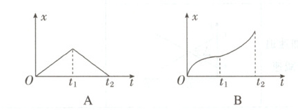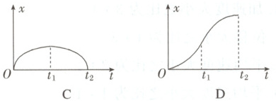 例① (2023·全国甲卷)一小车沿直线运动,从$t = 0$开始由静止匀加速至$t = t_1$时刻,此后做匀减速运动,到$t = t_2$时刻速度降为零。在下列小车位移$x$与时间$t$的关系曲线中,可能正确的是