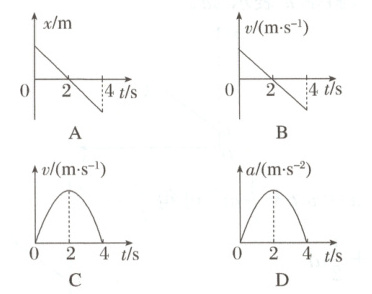 1. 四个质点均做直线运动,其运动规律分别如下列四幅图所示,其中$x$、$v$、$a$分别表示质点的位移、速度、加速度,则在$4\ s$末一定能回到初始位置($t = 0$时刻的位置)的是