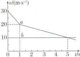 例④ 一辆小汽车以$30\ m/s$的速度匀速行驶在高速公路上,突然发现正前方$30\ m$处有一辆大卡车以$10\ m/s$的速度同方向匀速行驶,小汽车紧急刹车,刹车过程中刹车失灵。如图所示,图线$a$、$b$分别为小汽车和大卡车的$v-t$图像(忽略刹车反应时间),以下说法正确的是