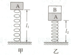 4. 如图甲所示,一轻质弹簧下端固定在水平面上,上端放一个质量为$2m$的物块A,物块A静止后弹簧长度为$l_1$;若在物块A上端再放一个质量为$m$的物块B,静止后弹簧长度为$l_2$,如图乙所示。弹簧始终处于弹性限度内,则 (
